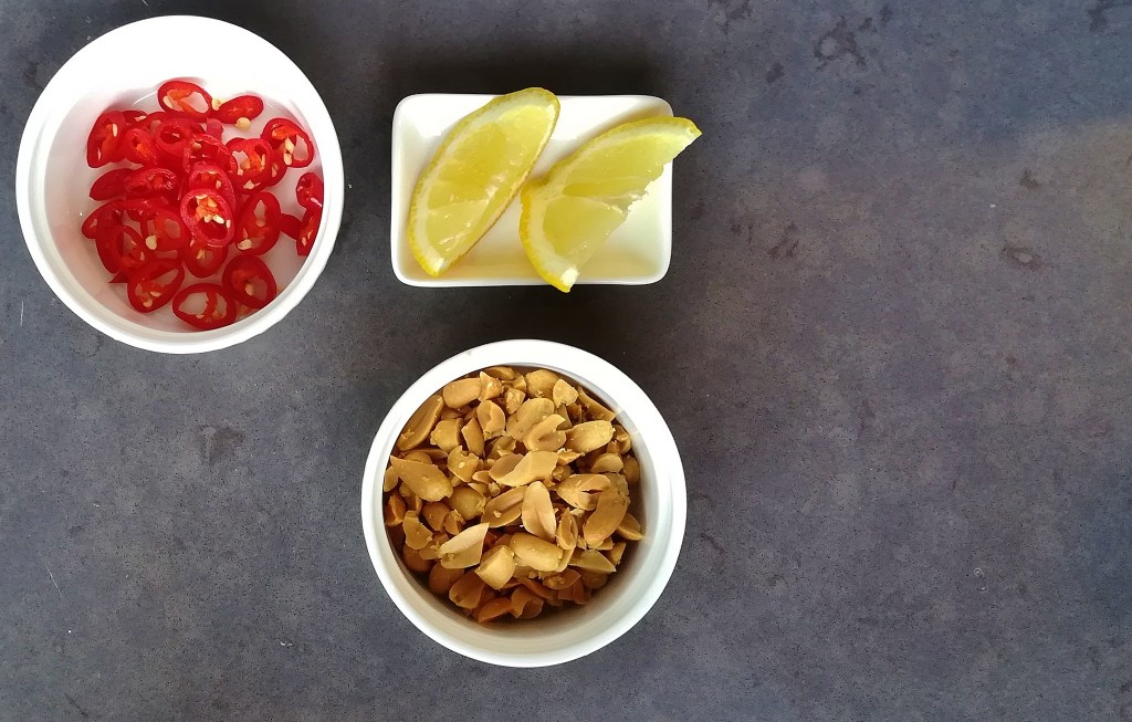 Dien de pad Karlijn op en zet de pinda’s, chilipeper en citroen op tafel om het gerecht mee af te maken.