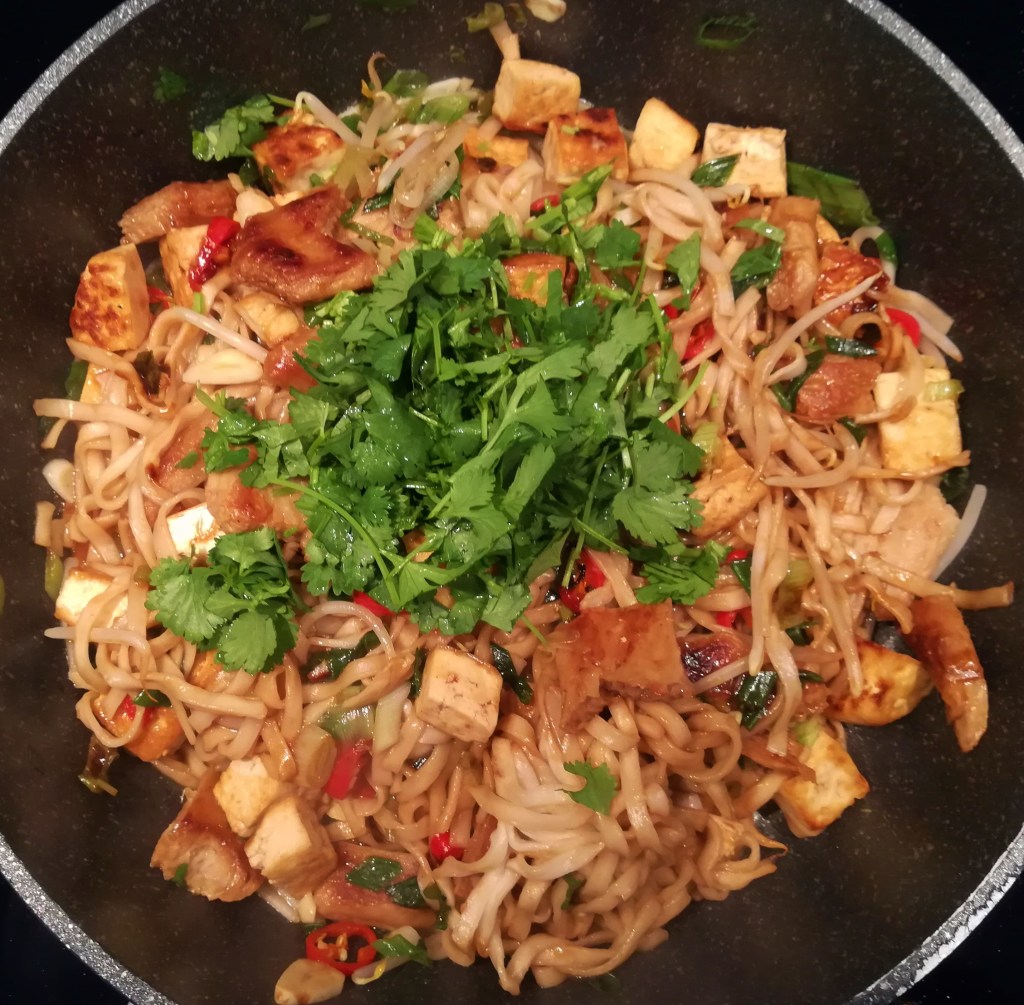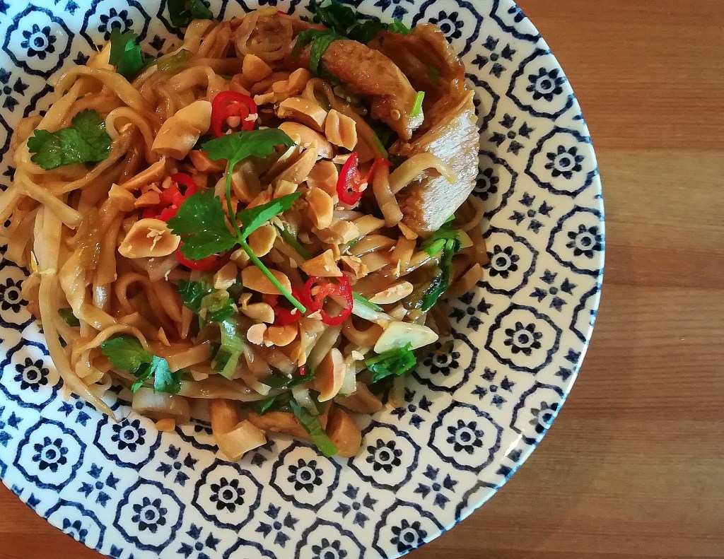 Pad thai is een van de populairste Thaise gerechten die er bestaan, maar of je het echt Thais kunt noemen, daar valt over te twisten. De Thai zien het zelf als Chinees gerecht, waarschijnlijk door Chinese invloeden na de Tweede Wereldoorlog ontstaan. Hoe dan ook is het een erg lekker en zomers gerecht. Een échte pad thai zal ik waarschijnlijk nooit kunnen namaken. Maar deze ‘pad Karlijn’ – met tofu en vegetarische kipstuckjes – is ook heel erg lekker, kan ik je vertellen.