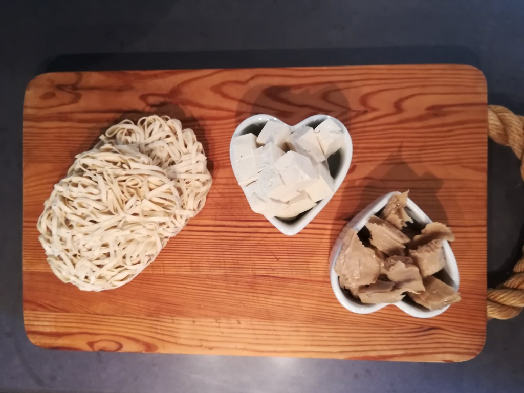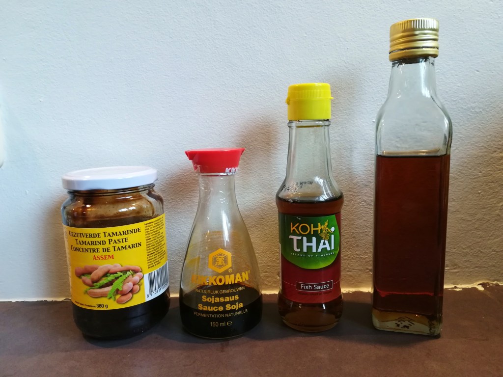 – 150 gram platte, brede noedels (traditioneel rijstnoedels, maar ik vind tarwenoedels ook lekker)
