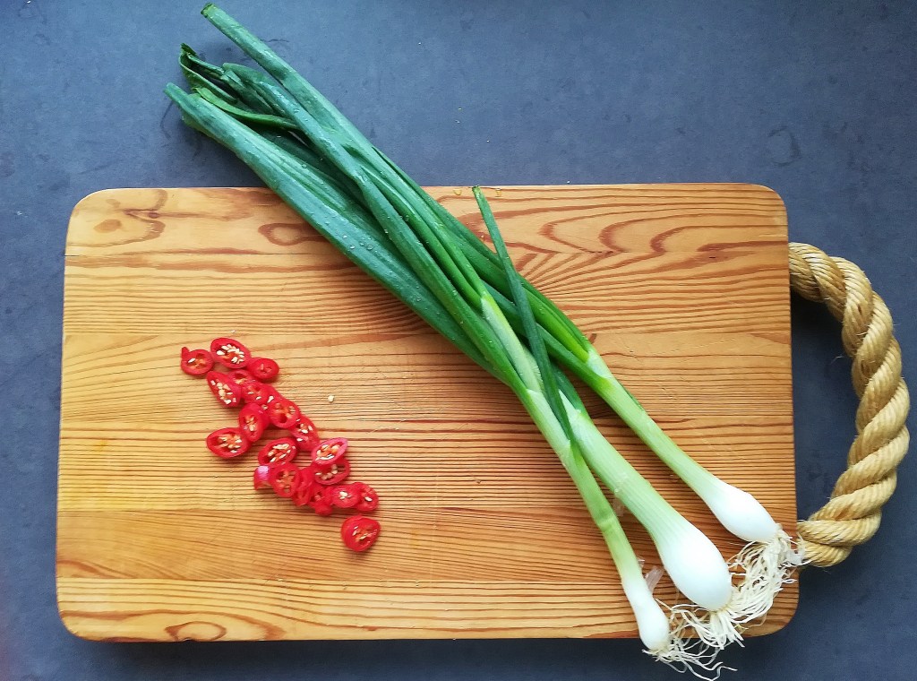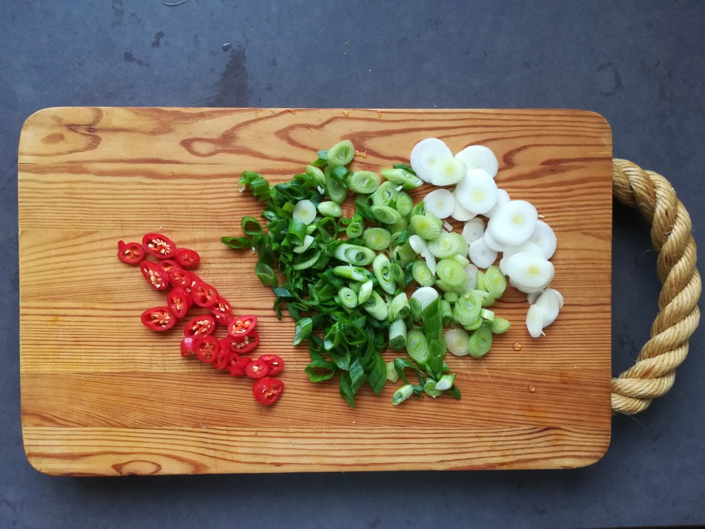 Omdat je op hoog vuur bakt, is het handig om eerst alle ingrediënten voor te snijden. Snijd de tofu in blokjes en de knoflook in plakjes. Snijd de rode pepers in ringetjes; houd er één apart in een schaaltje om op tafel te zetten. Snijd de lente-uitjes ook in ringetjes en hak de koriander en pinda’s grof. Snijd de citroen in partjes.