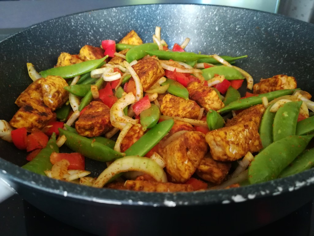 Verhit nog wat olie in een wok of hapjespan op hoog vuur. Voeg als eerste de tempéblokjes toe, met alle specerijen, en bak je blokjes mooi goudbruin. Voeg de ui en paprika toe en bak die even mee. In dit stadium kun je eventueel de trassi toevoegen. Voeg de sugar snaps toe en bak dit goed door, tot de boontjes felgroen zijn en beetgaar.