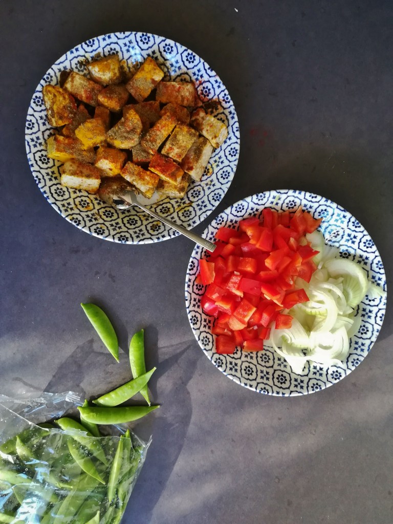 Maak ondertussen de tempéschotel. Meng de tempéblokjes met alle specerijen en een klein scheutje olie, totdat de blokjes helemaal zijn bedekt.Je hebt op dit moment een overschot aan specerijen, maar dat hoort. Snijd de ui in halve ringen en de rode paprika in blokjes.