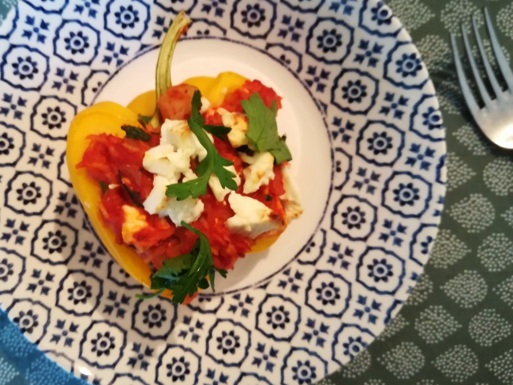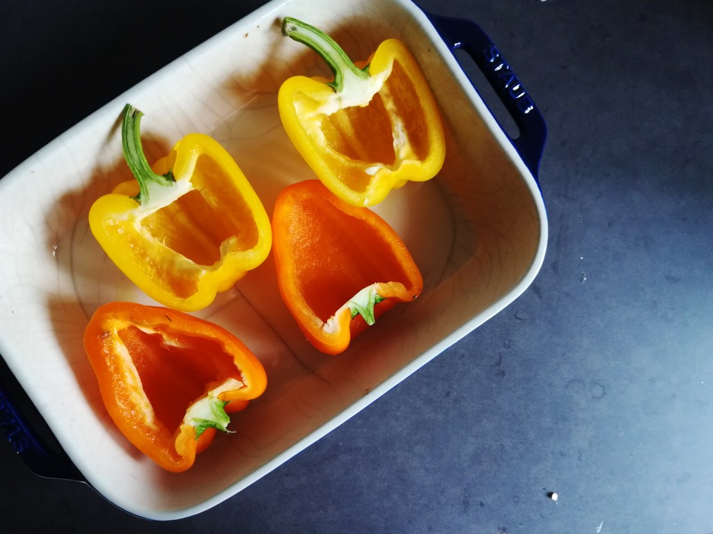 Snijd de paprika’s in de lengte doormidden en verwijder de zaadlijsten en zaadjes. Leg ze in een ingevette ovenschaal met de bolle kant naar beneden en schep ze goed vol met de vulling (duw de vulling ook goed aan). Als je teveel vulling hebt, kun je deze ook naast de paprika’s scheppen en meebakken in de oven. Verkruimel de rest van de kaas boven de paprika’s (dit moet je misschien ook een beetje aandrukken) en bak de paprika’s 25-30 minuten in de oven.
