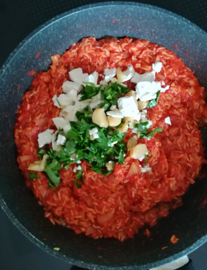 Voeg de oregano, passata en rijst toe en breng het geheel op smaak met zout en peper. Breng dit aan de kook en laat dit zachtjes 25-30 minuten pruttelen tot de rijst gaar is. Voeg als het mengsel te droog wordt een beetje water toe. Het moet qua vochtigheid op risotto lijken. Hak ondertussen de bladpeterselie fijn en verwarm de oven voor op 180 °C. Voeg als de rijst gaar is de peterselie toe, verbrokkel de helft van de kaas boven het mengsel en knijp de knoflookbol uit boven de pan. Roer alles goed door elkaar.
