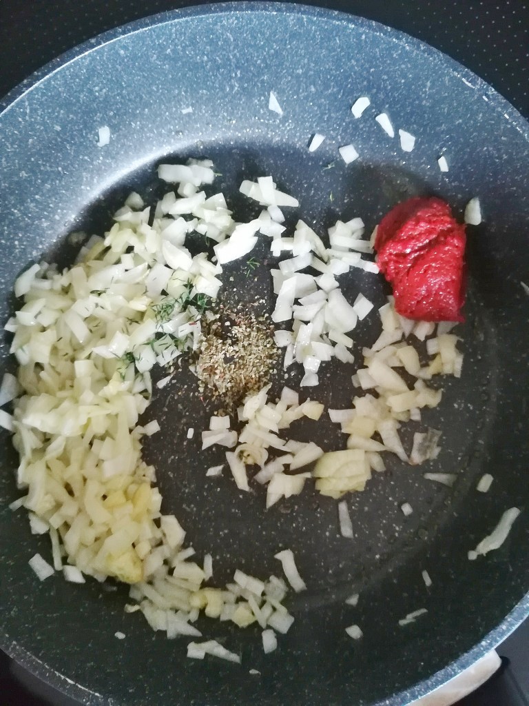 Maak nu de rest van de vulling. Snipper de ui en ris de takjes tijm. Verhit wat olijfolie in een grote pan en fruit de ui een paar minuten tot hij glazig is. Voeg de tijmblaadjes, het gerooktepaprikapoeder en de paprikapasta toe en bak dit even mee.