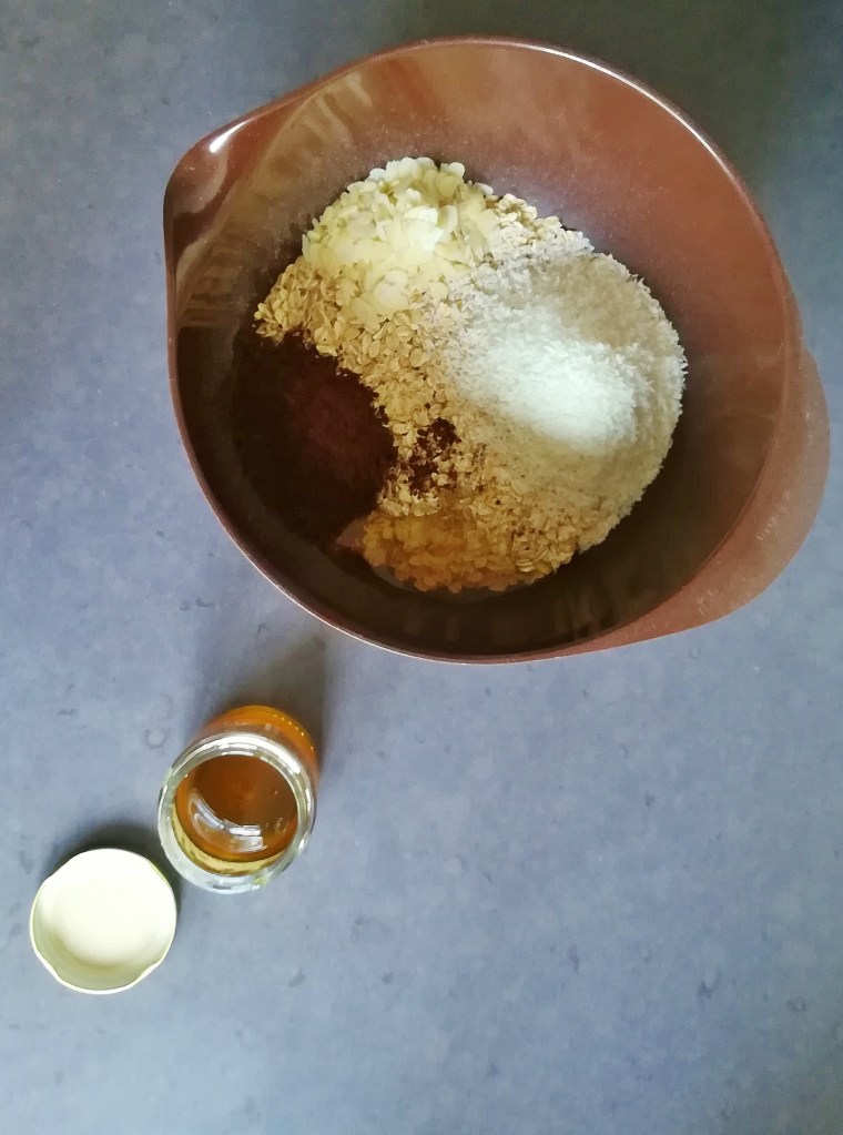 Verwarm de oven voor op 150 °C. Doe alle droge ingrediënten in een kom en roer ze goed door elkaar. Voeg de honing en de olie toe en meng alles goed door elkaar.