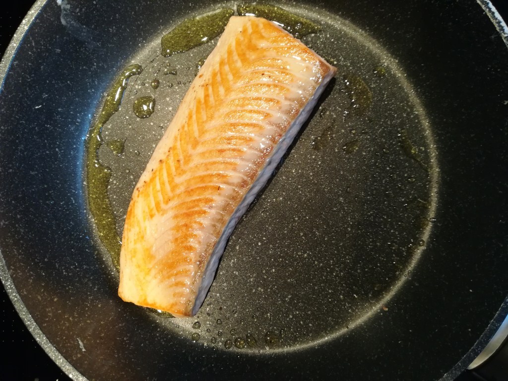 Verhit wat olie in een grote pan op middelhoog vuur. Bak de zalm het liefst als één groot stuk. Bestrooi hem met zout en peper en bak hem enkele minuten per kant, tot hij mooi goudbruin is aan de buitenkant en nog een klein beetje rosé aan de binnenkant. Als je zalm met huid lekker vindt, kan je dat uiteraard ook gebruiken (tip: haal na het bakken de huid los en bak die apart extra krokant in de pan). Haal de zalm uit de pan en ‘breek’ hem in stukjes.