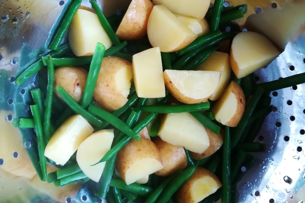 Spoel de aardappels goed af, snijd eventuele uitlopers of plekjes van de aardappels (je hoeft ze niet te schillen) en snijd ze in grove (net aan hapklare) stukken. Snijd de haricots verts doormidden. Kook de aardappels in ongeveer 9 minuten beetgaar en voeg halverwege de kooktijd (na 4-5 minuten) de haricots verts toe. Giet af en spoel even af onder koud water zodat de boontjes mooi groen blijven.