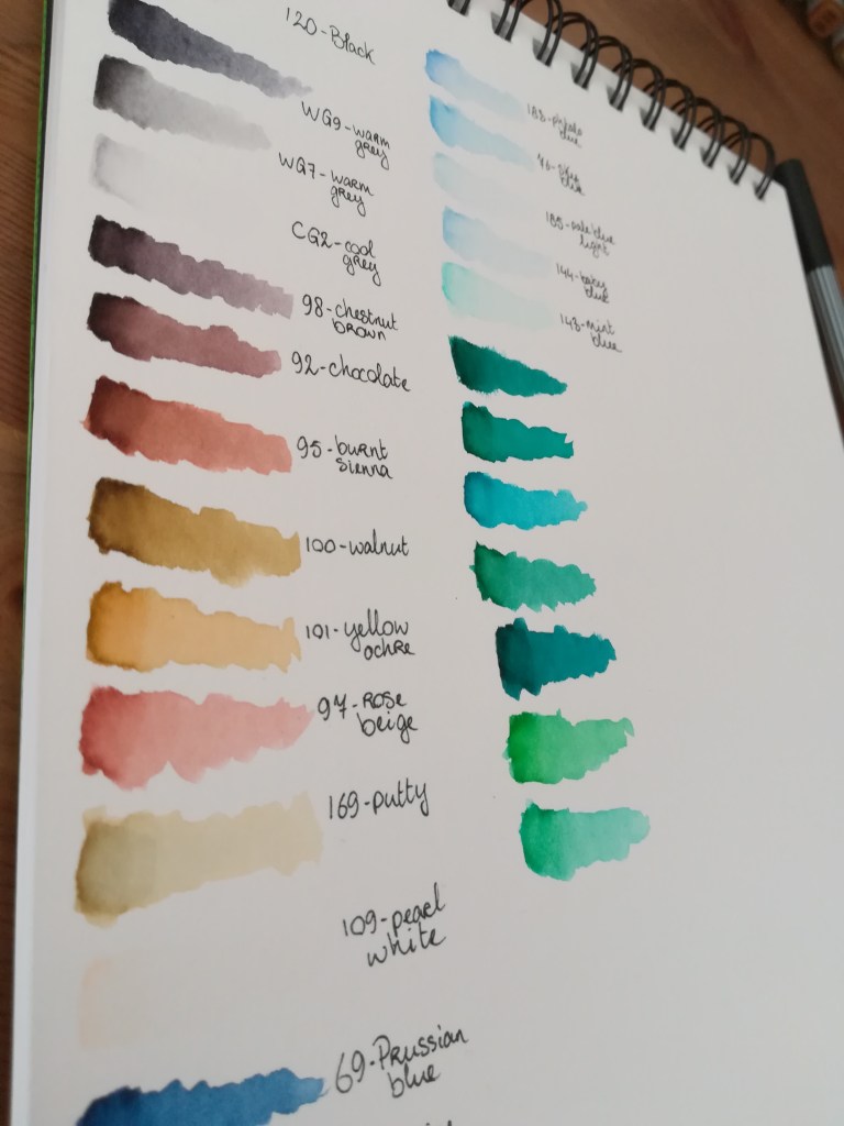 De eerste indruk van de stiften was gelijk goed. De kleuren zijn heel helder en zoals je op de foto kunt zien zijn ze echt goed met water te mengen. Ik was echt aangenaam verrast door de kleurintensiteit. Ik gebruikte hierbij een ‘water brush‘ (een synthetisch borsteltje met een waterreservoir); ik heb die speciaal gekocht om fijn met deze stiften te kunnen werken. Met een penseeltje heb ik ze nog niet uitgeprobeerd. Ik gebruik hiervoor ook vrij glad papier, omdat ik bij mijn ecolinestiften merkte dat het aquarelpapier dat ik toen gebruikte de kleurstof te snel ‘opzoog’ waardoor ik moeite had om de kleuren te vervagen en vloeiend te laten overlopen. Met het gladdere papier en de water brush had ik daar nu in elk geval geen last van, de kleuren zijn echt heel mooi te vervagen.