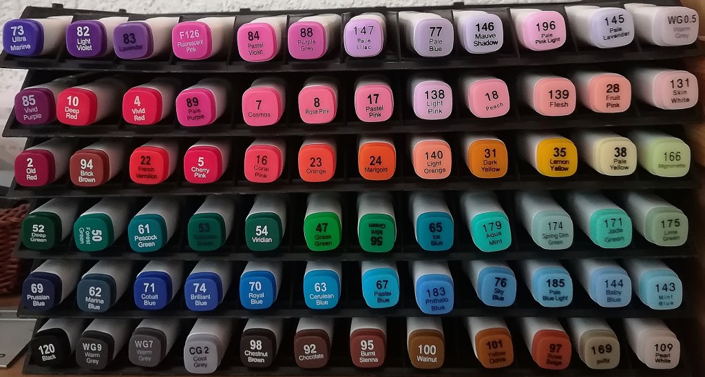 Hierboven zie je alle 72 kleuren die in de grote sets zitten. Op het eerste gezicht is het een mooie verzameling van prachtige, heldere kleuren. Toch heb ik hier een paar kritische noten bij. Ten eerste is het noodzakelijk dat je de kleuren eerst uitprobeert voordat je ermee gaat werken. De kleur op de dop van de stift is namelijk lang niet altijd hetzelfde als de kleur die er daadwerkelijk uit komt. Daardoor kan je toch nét iets minder makkelijk wat stiften uit je rekje plukken om mee aan de slag te gaan (ik hou het vel dat ik gemaakt heb altijd bij de hand bij het tekenen). Ten tweede lijken sommige kleuren wel heel erg op elkaar. Vooral bij de groene set valt dat op: deep green, forest green en veridian lijken allemaal behoorlijk hetzelfde. Maar ook orange en marigold zijn vrij identiek. Voor pale purple, purple grey en pastel violet geldt hetzelfde. Dus of je nou echt van 72 verschillende kleuren kan spreken…? Tegelijkertijd missen er wel nog een paar kleuren. Er zijn geen natuurlijke groene tinten (ik mis olijfgroen!) en dat is lastig als je stengels en bladeren wilt tekenen. Daar is zeker nog winst te behalen dus. Ik zag laatst tussen alle stiften bij de Action ook een kleinere set aqua markers liggen, met nieuwe kleuren. Wie weet komen daarmee ook wat natuurlijkere groentinten in de winkel terecht.