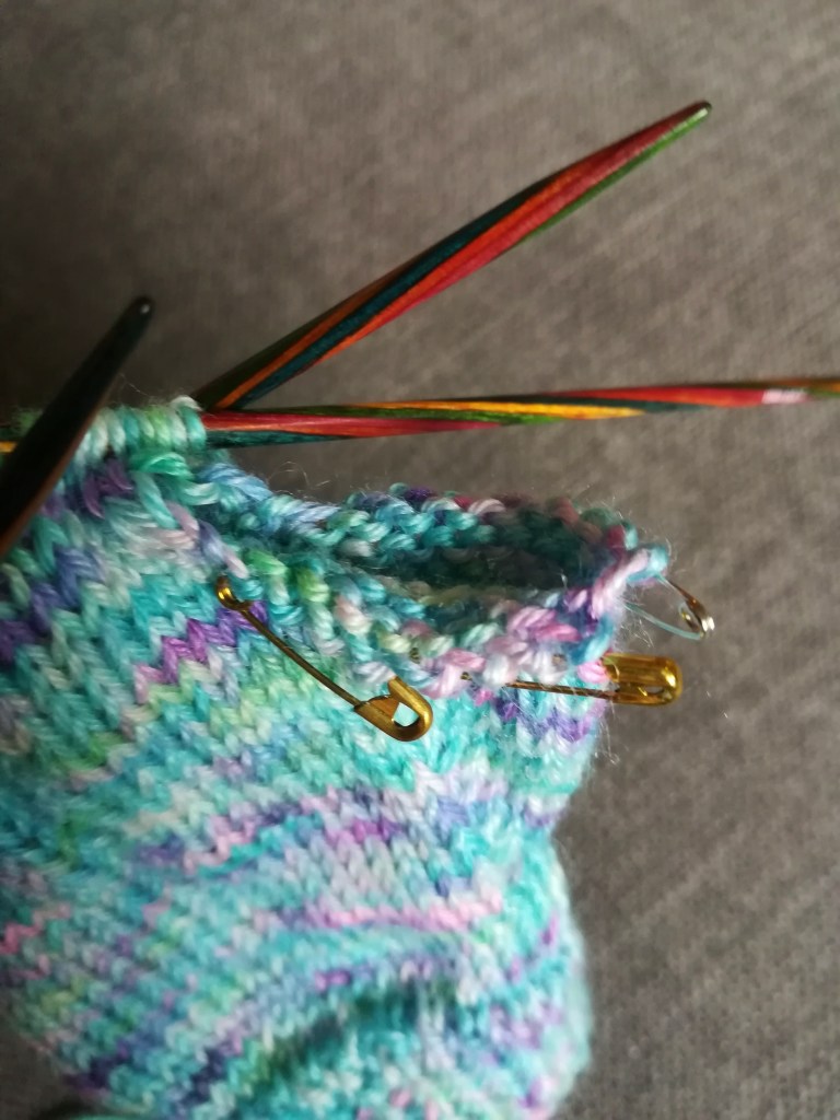 Als laatste ben ik begonnen met wat aanvullingen op mijn Stones on the beach-muts. Ik heb besloten om hier polswarmers en een colletje bij te maken. Voor de polswarmers gebruik ik het patroon Cloudburst (dat op zichzelf ook al erg mooi is, moet ik zeggen) met een aanpassing van het patroontje. Het bedenken van de aanpassing was op zich niet moeilijk, maar het volgen van die aanpassingen ging vervolgens nogal mis… een van de polswarmers moest ik dus weer helemaal uithalen en verbeteren. Mocht je het jezelf makkelijk willen maken, koop dan gewoon de bijbehorende patronen… De col maak ik gewoon zo groot als nog mogelijk is met het garen dat ik uiteindelijk overhoud.