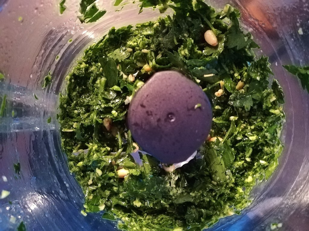 Maak intussen de pesto. Rooster eerst de pijnboompitten kort in een droge koekenpan. Snijd de peterselie en de knoflook grof en doe ze samen met de rucola, pijnboompitten en 1 eetlepel olijfolie in de foodprocessor. Maal alles tot kleine stukjes. Voeg ondertussen zoveel olijfolie toe dat een smeuïge ‘pesto’ ontstaat.
