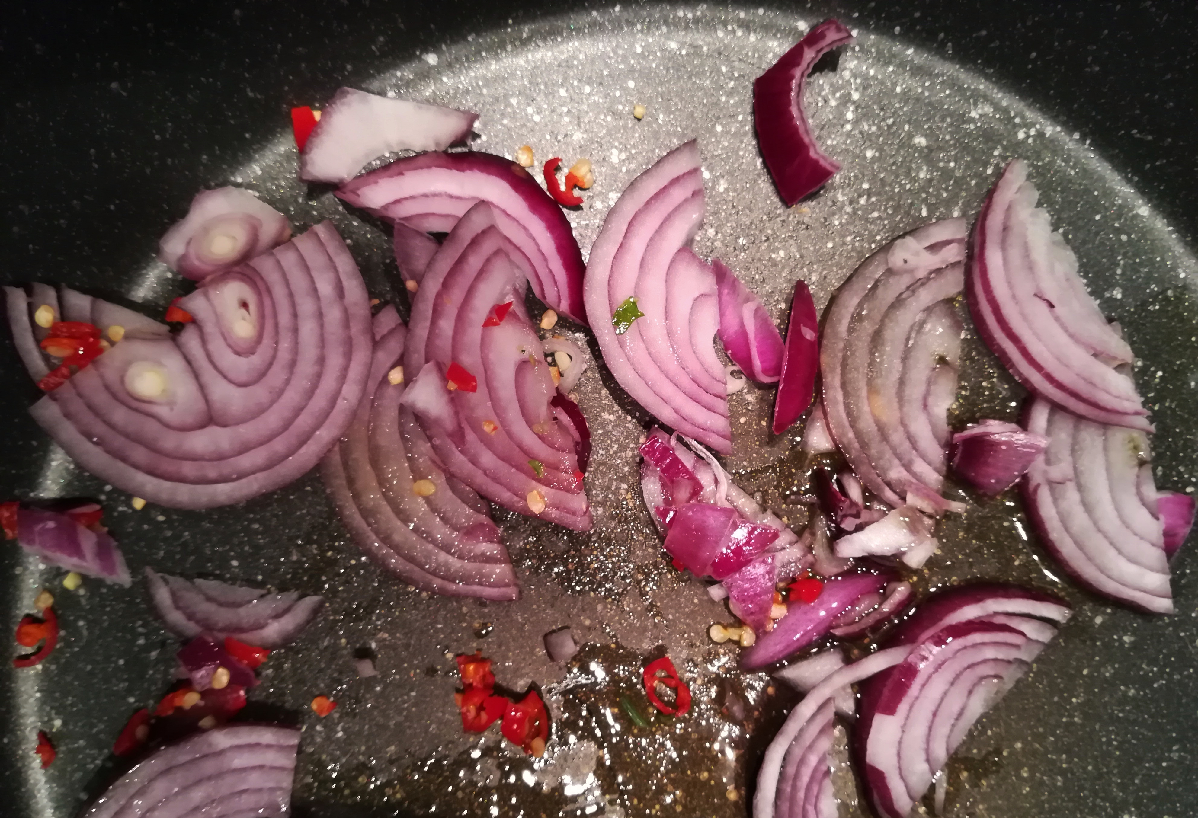Snijd de rode ui in dunne halve ringen en de rode peper in kleine stukjes. Giet een klein scheutje olijfolie in een grote hapjespan en bak de ui en peper kort aan. Voeg nu het koriander- en paprikapoeder toe en bak dit even mee. Kook ondertussen ook de pasta volgens de aanwijzingen op de verpakking.