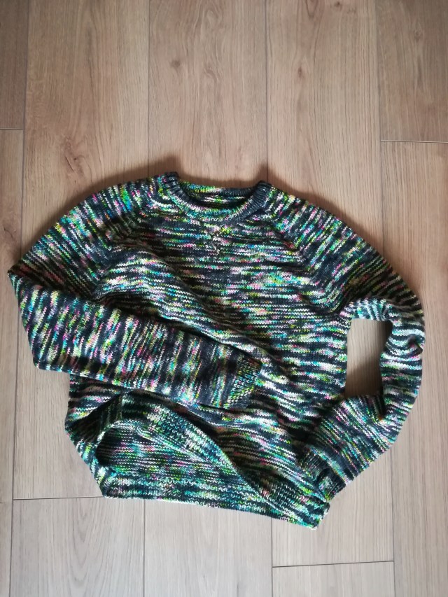 Het gratis patroon vraagt eigenlijk om DK weight, iets dikker dus dan deze wol (die is namelijk sport weight). Ik heb daarom een maatje groter gebreid dan ik eigenlijk nodig zou hebben. Alsnog heb ik tijdens het breien wat kleine aanpassingen gemaakt; ik ben net iets minder lang doorgegaan met het meerderen bij de raglanhals. Hierdoor is de pasvorm net niet helemaal goed. De mouwen zijn vrij strak, strakker dan eigenlijk de bedoeling is bij het patroon, en daardoor ‘trekken’ ze een beetje bij de oksels (waardoor je zo’n vouw krijgt). Toch vind ik de pasvorm goed genoeg, zeker voor een allereerste trui.